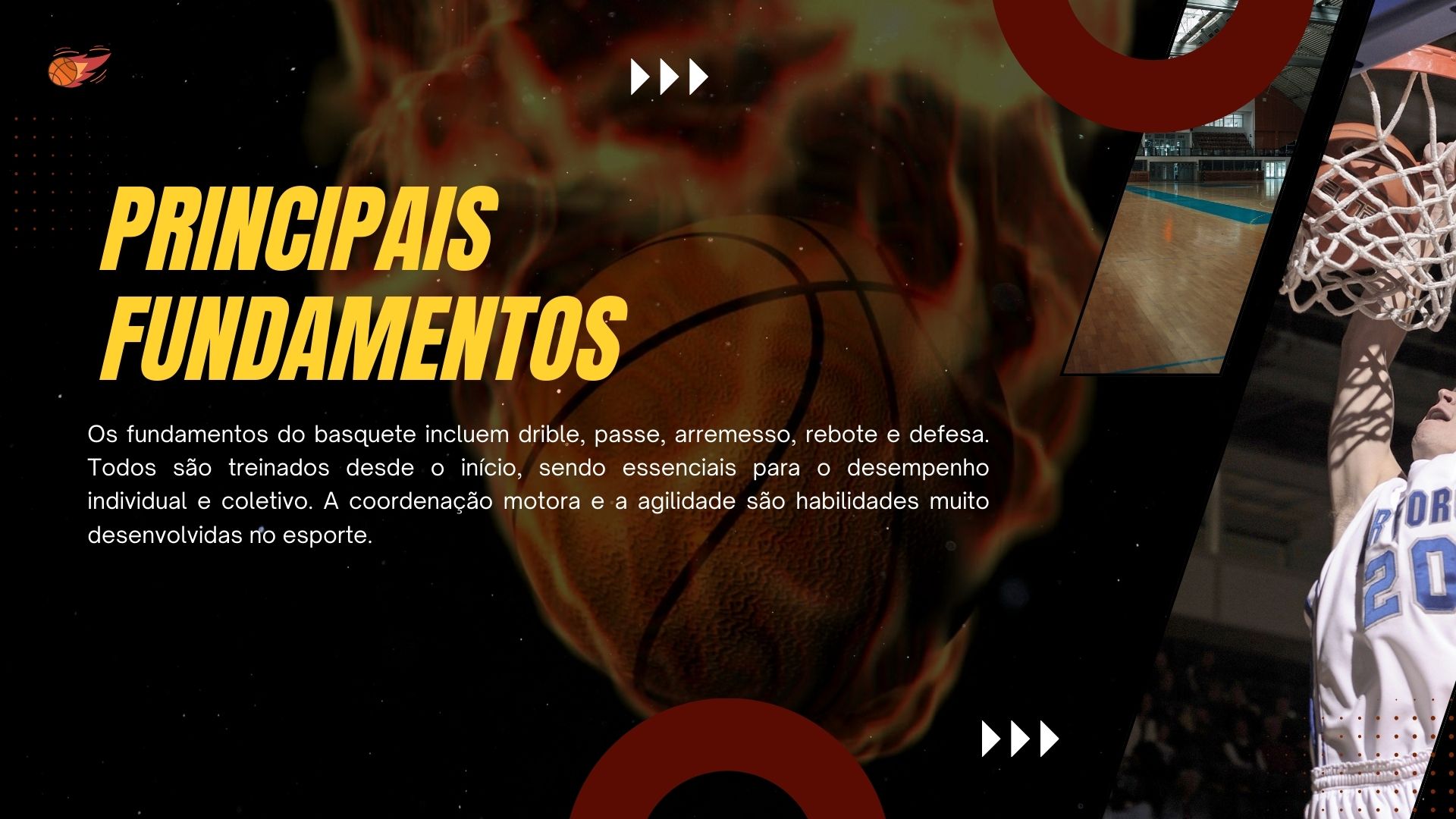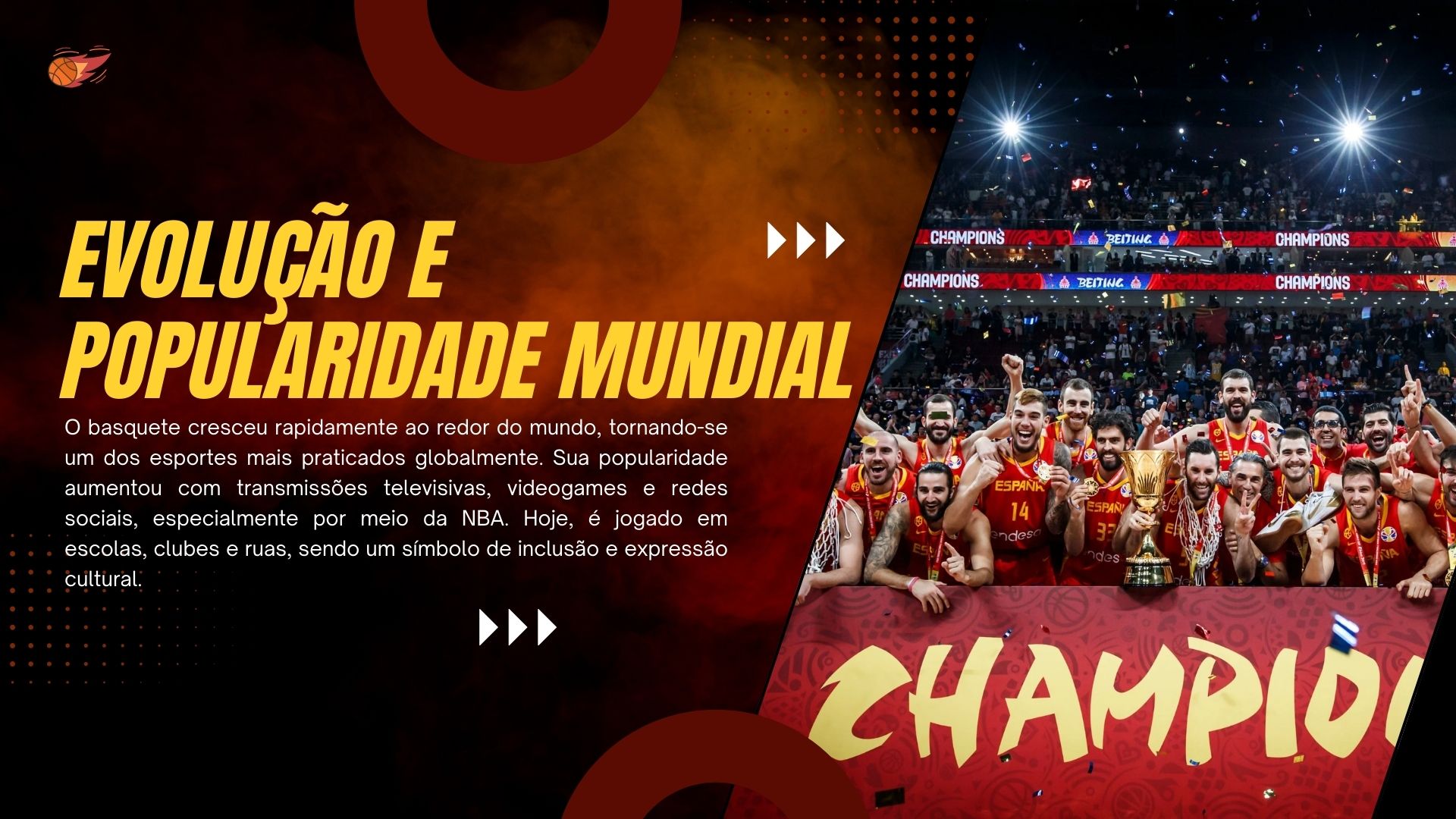Esse slide já vem totalmente pronto e ainda é editável no Canva e no PowerPoint, com transições dinâmicas que deixam a apresentação muito mais envolvente. Ideal para trabalhos escolares, apresentações acadêmicas ou projetos esportivos. Possui conteúdo histórico, regras e curiosidades do basquete.