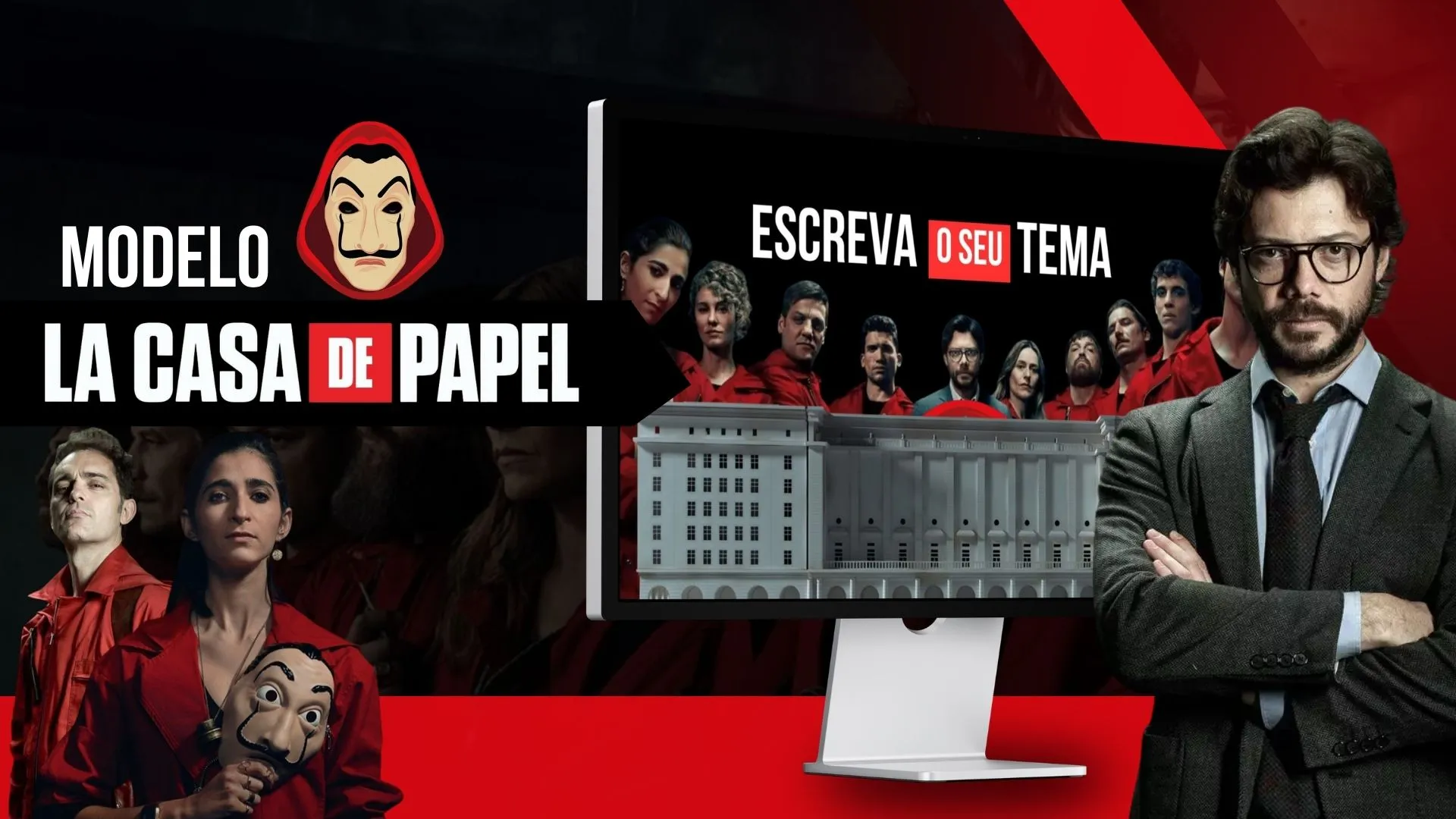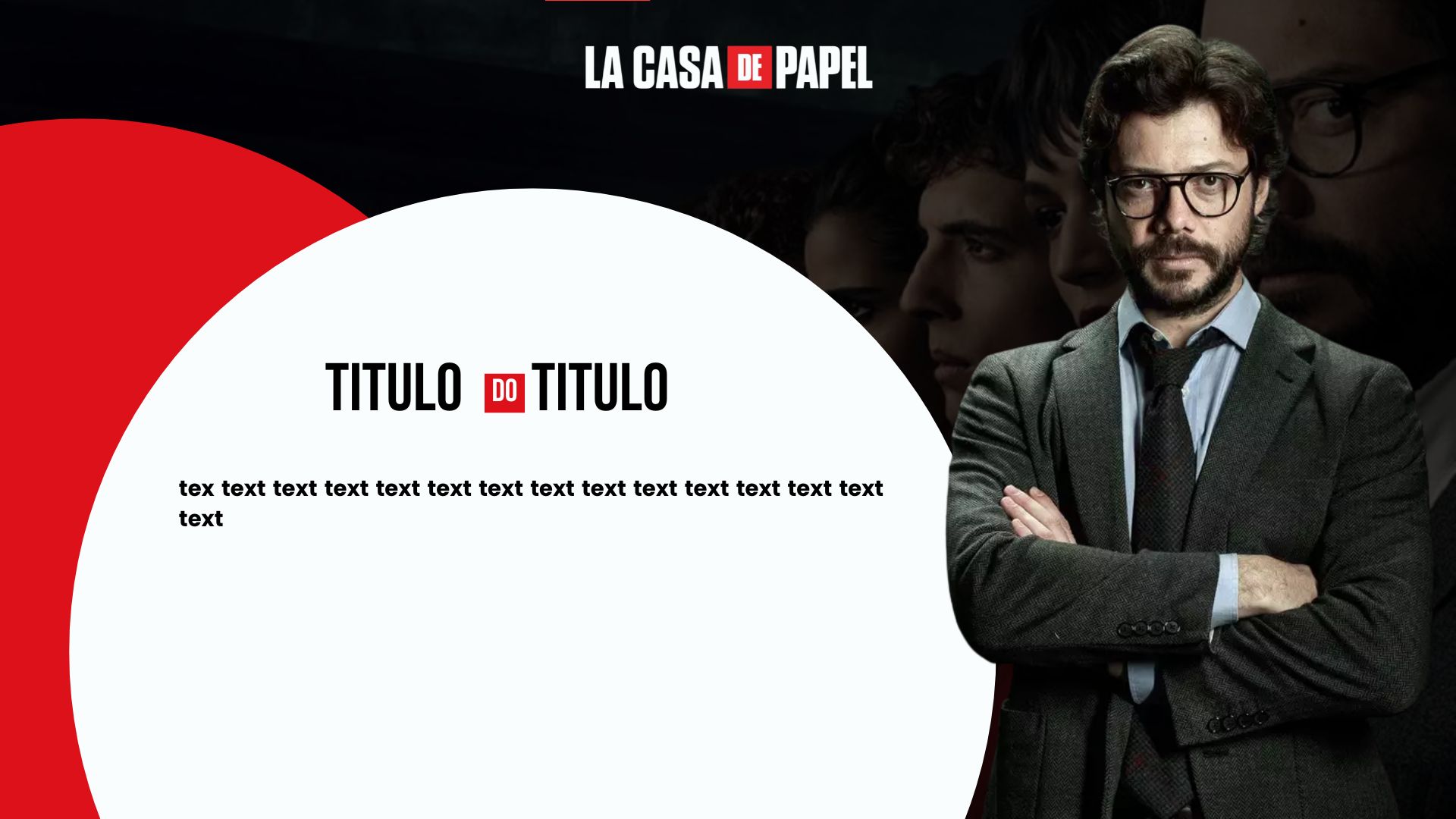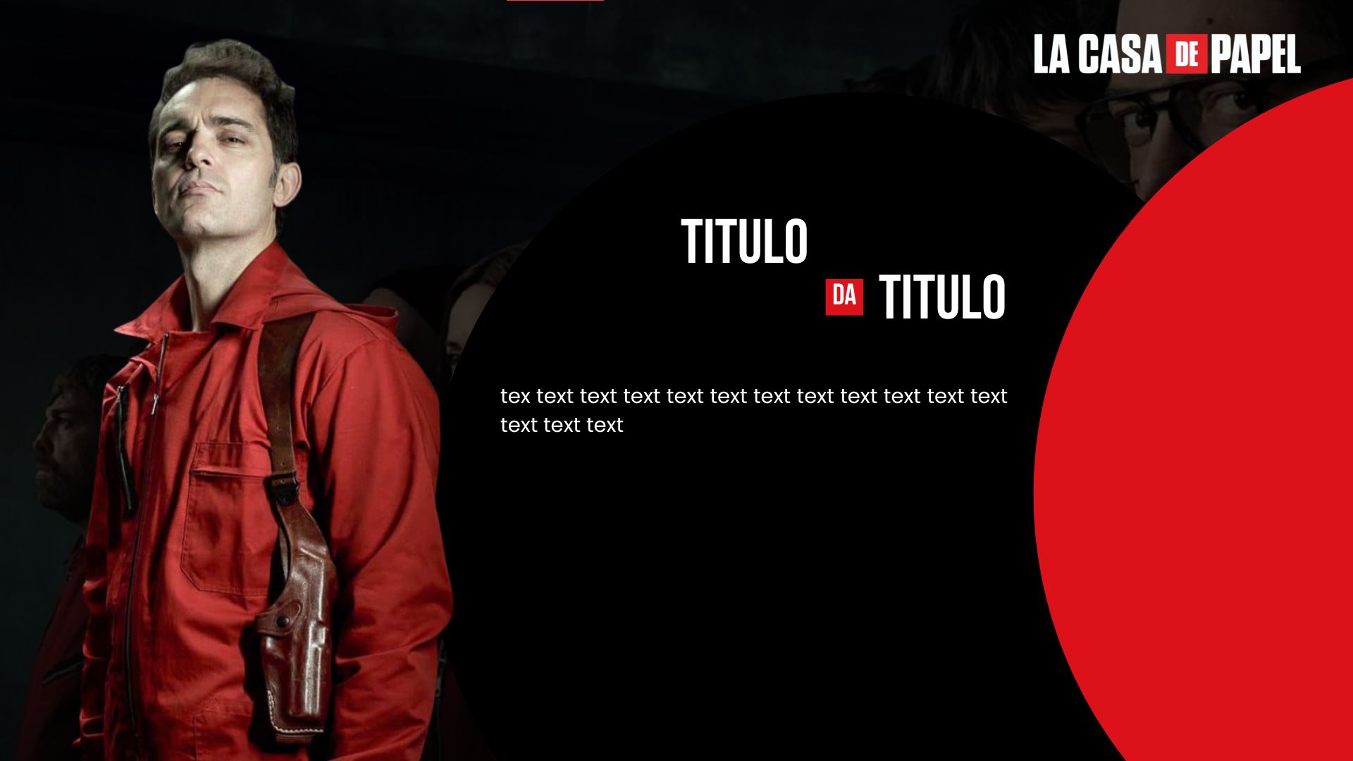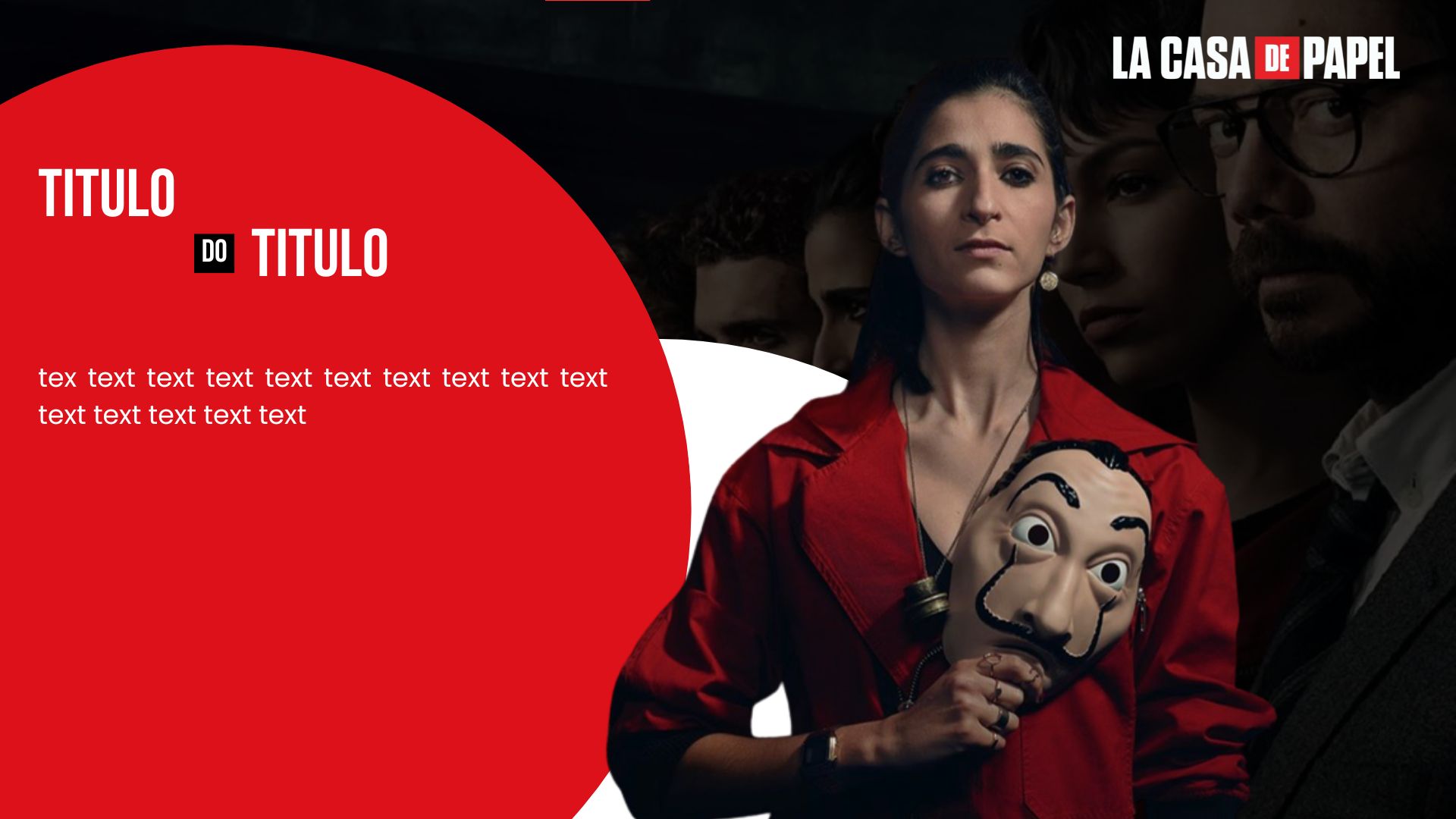 Modelo de slide editável inspirado na estética da série La Casa de Papel, com design marcante e moderno, pronto para personalizar com seu próprio conteúdo de forma simples. Possui estrutura organizada com espaço para textos e imagens, totalmente editável no Canva. Ideal para temas sobre estratégia, economia, sociedade, segurança ou qualquer outro assunto.