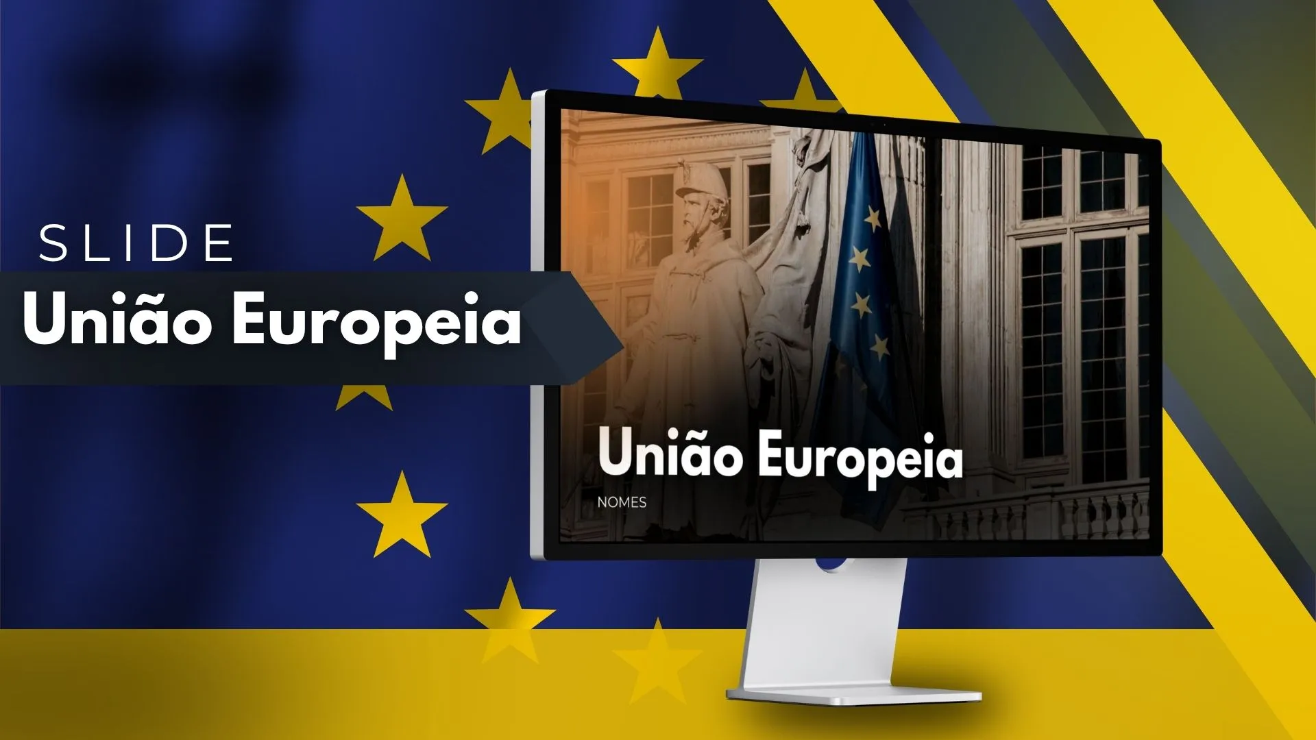 Slide editável sobre a União Europeia, com design organizado e visual educativo, ideal para apresentação e trabalho escolar. Possui páginas prontas com espaço para textos, imagens, mapas e informações importantes, facilitando a explicação do conteúdo. Disponível em Canva e PowerPoint, com edição simples e rápida.